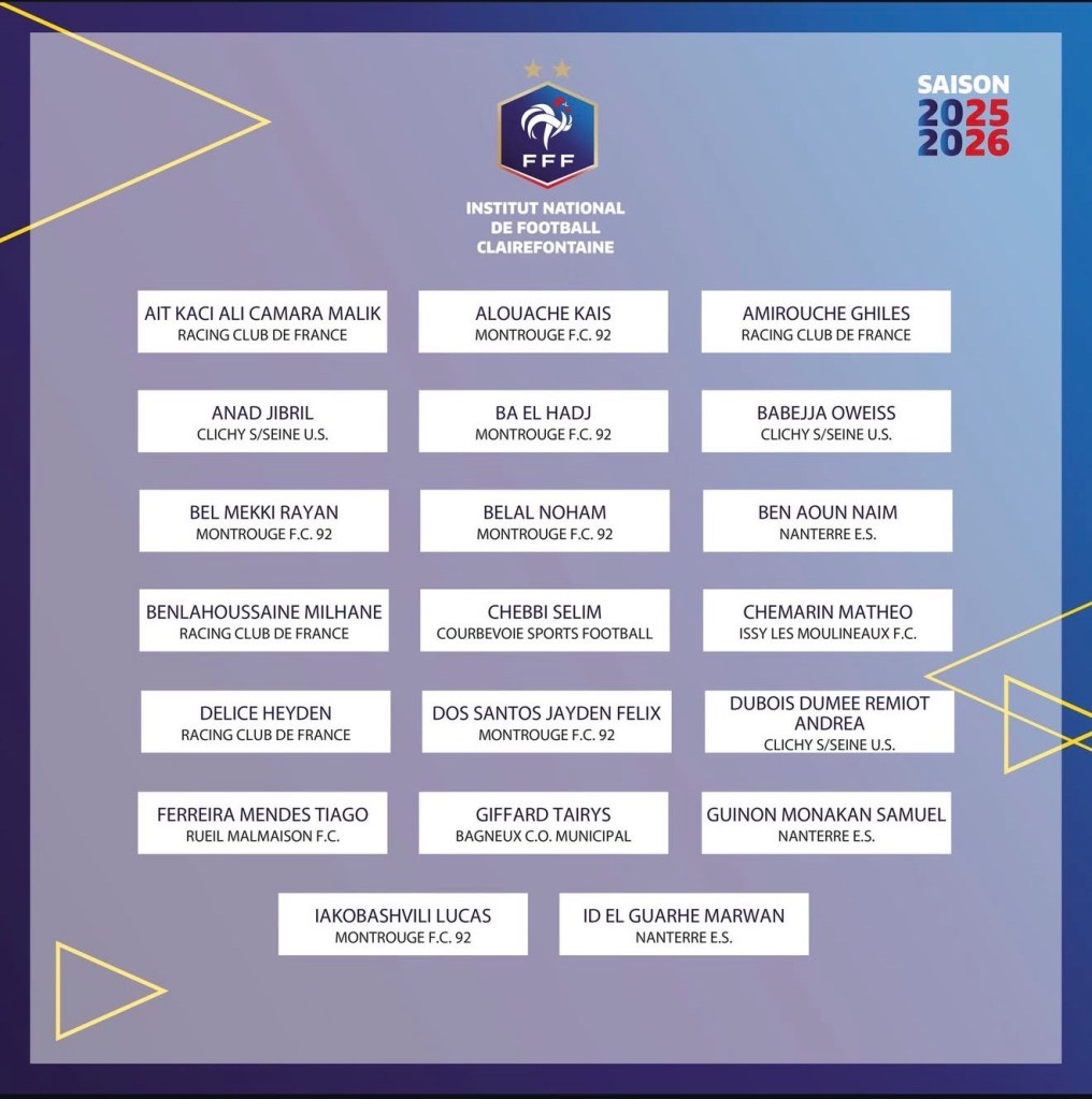 Nous tenions Ă annoncer et Ă fĂ©liciter les joueurs convoquĂ©s au premier tour rĂ©gional de lâINF Clairefontaine :